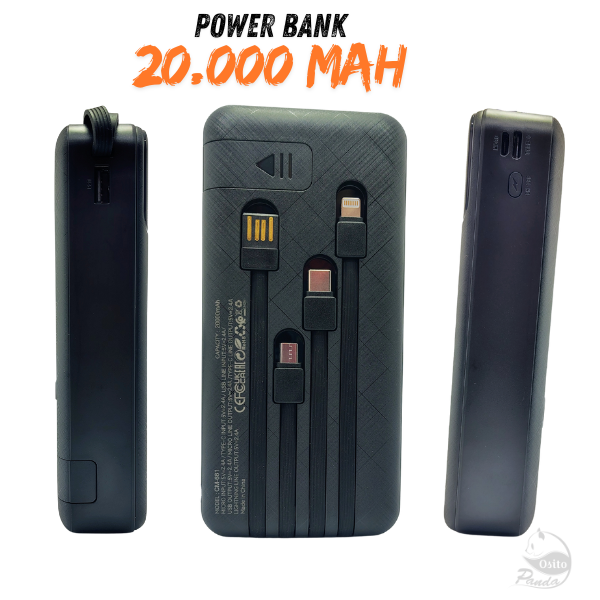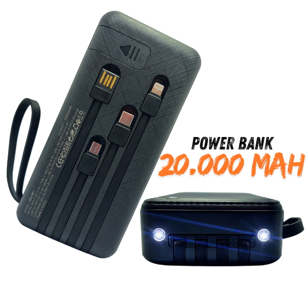 Mantén todos tus dispositivos cargados estés donde estés con esta poderosa y versátil batería portátil de 20.000 mAh. Con 4 cables incorporados, puertos de entrada dobles y linterna LED integrada, esta Power Bank es el compañero ideal para viajes, trabajo, estudio o emergencias.