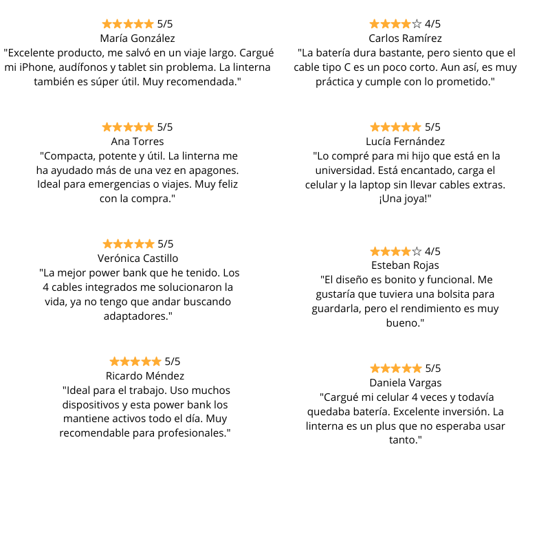 Esta Power Bank cuenta con 4 cables de carga integrados, listos para usar en cualquier momento: